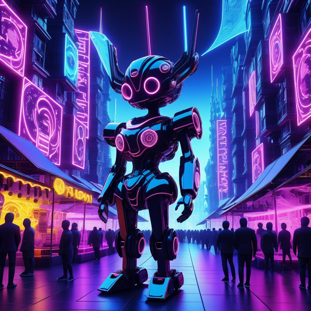 A high-quality 3D render of a transforming robot standing prominently in a neon-lit futuristic city marketplace. The scene features vibrant blue and purple neon hues illuminating tall sci-fi buildings and bustling crowds, inspired by styles of H.R. Giger and Yayoi Kusama, with psychological and cyberpunk themes.