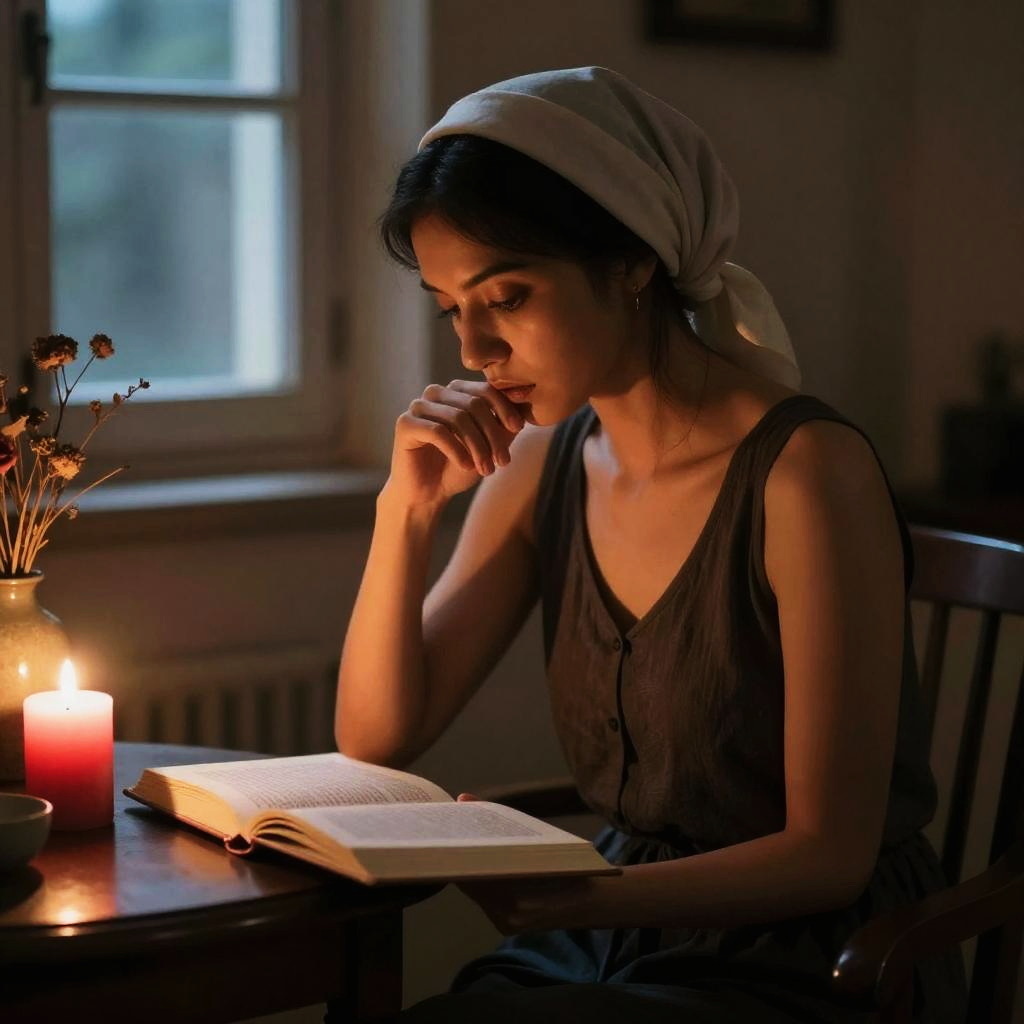 Photograph of a young woman with long, wavy brown hair, sitting in a dimly lit room. She's wearing a white, lace-trimmed blouse and a deep red skirt. She's focused on a book she's holding, with a warm candlelight glow illuminating her face and the book. The background is dark, adding a cozy, intimate atmosphere.