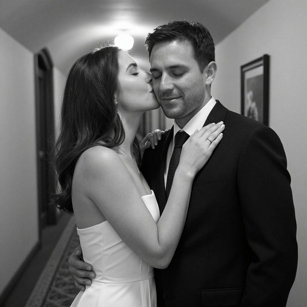 Intimate moment captured in black and white as a woman in a strapless dress gently kisses a man's cheek while he stands in a formal suit, her hand tenderly resting on his chest in a dimly lit, arched hallway.