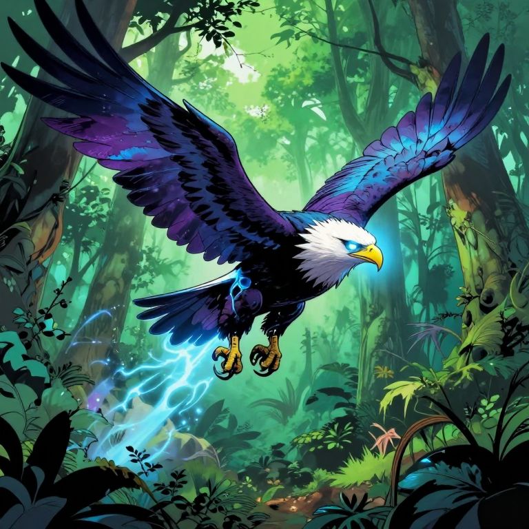 Digital illustration of a vibrant, detailed forest scene featuring a majestic, large bird of prey with striking blue and black feathers, white head, and yellow beak. The bird is mid-flight with wings extended, emitting blue electric sparks from its tail. The lush forest background is rich with various shades of green, dense foliage, and sunlight filtering through the trees, creating a mystical atmosphere. The bird's talons are outstretched, and its intense gaze is directed forward. The artwork blends fantasy and realism with bold colors and dynamic lighting.