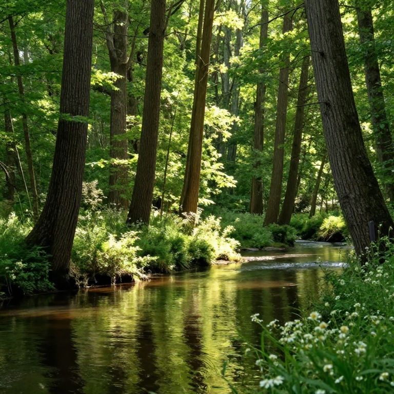 Photograph of a serene forest scene with tall, straight trees with dark brown trunks and lush green foliage. Sunlight filters through the leaves, creating a bright, dappled effect on the forest floor and reflecting in a calm, narrow stream in the foreground. The stream's surface is dark with golden reflections from the sunlight. Green shrubs and small white flowers line the stream's edge, adding texture and detail. The background is dense with more trees, creating a peaceful, secluded atmosphere. The overall color palette includes greens, browns, and touches of yellow from the sunlight.