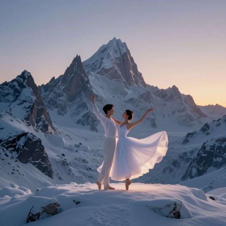 An ethereal symphony of serenity unfolds as jagged peaks embrace the soft glow of a celestial ballet, their icy whispers echoing the timeless dance between solitude and wonder.