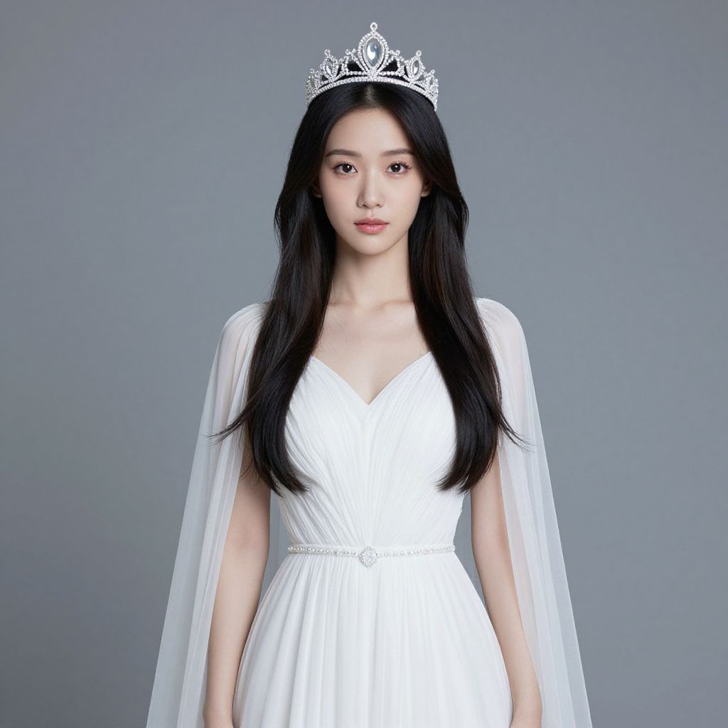Photograph of an East Asian woman with long, straight black hair, wearing a white, V-neck, sleeveless dress with a sheer cape. She has a silver, ornate tiara on her head. Her complexion is fair, and she has a calm, neutral expression. The background is a plain, light gray. The dress has a subtle, pleated texture, and her makeup is minimal, emphasizing her natural beauty. The overall style is elegant and regal, reminiscent of a princess or bride. The image is well-lit, highlighting the simplicity and purity of her white attire.