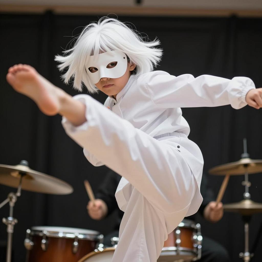A child wearing a white mask, long white wig, and a white outfit is captured mid-kick with an extended right arm. The child has an intense facial expression and dynamic pose. In the blurred background, a drum set and drummer are visible, suggesting an indoor studio or performance setting with overhead lighting.