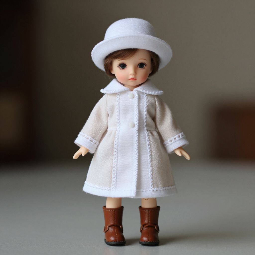 A detailed doll standing on a smooth surface, dressed in a white coat with delicate white trim and a matching white hat that sits neatly on its head. The doll wears brown leather boots on its feet, adding a touch of warmth and realism to its appearance. Its beige coat features subtle white accents along the sleeves and hem, giving it a soft, elegant look. The scene is softly lit, with gentle shadows and a quiet, nostalgic atmosphere, emphasizing the doll's delicate features and timeless charm.