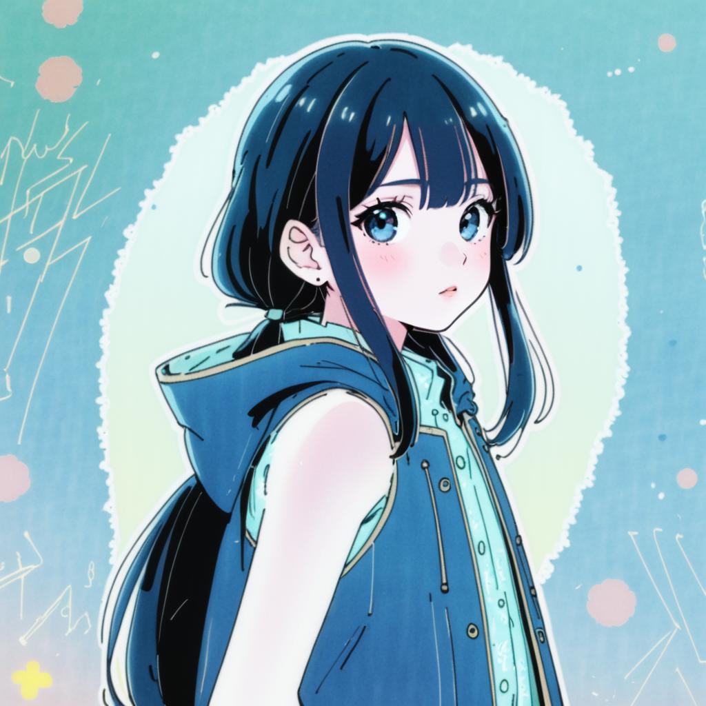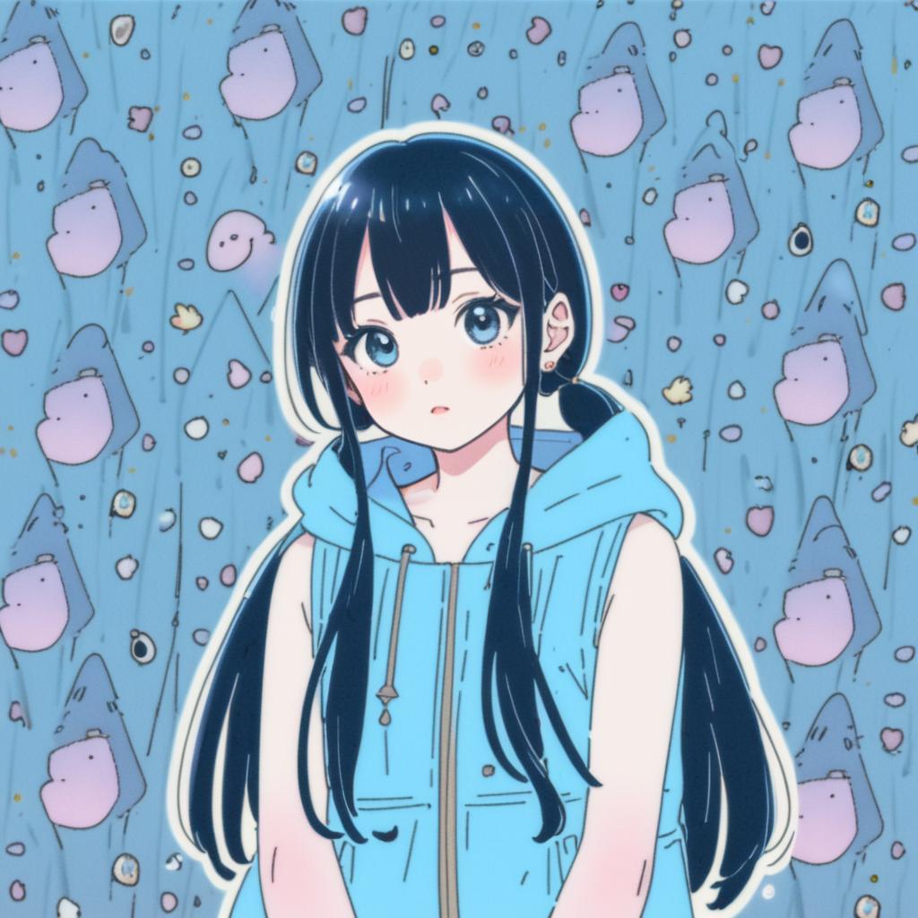 Amano hina (tenki no ko), tenki no ko, 1girl, blue eyes, long hair, black hair, low twintails, sleeveless jacket, hood down, bare arms, by artist sorimachi-doufu, anime