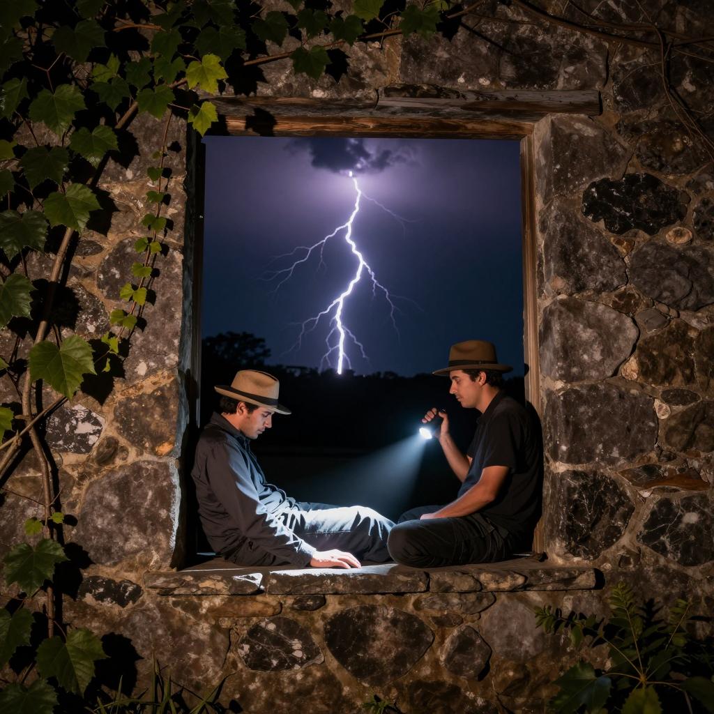 Photograph of a person with curly brown hair, facing away, raising a wooden spear towards bright, jagged lightning bolts. Tall trees in the background, daylight, intense light flare, dense green foliage, person's right arm extended upwards.