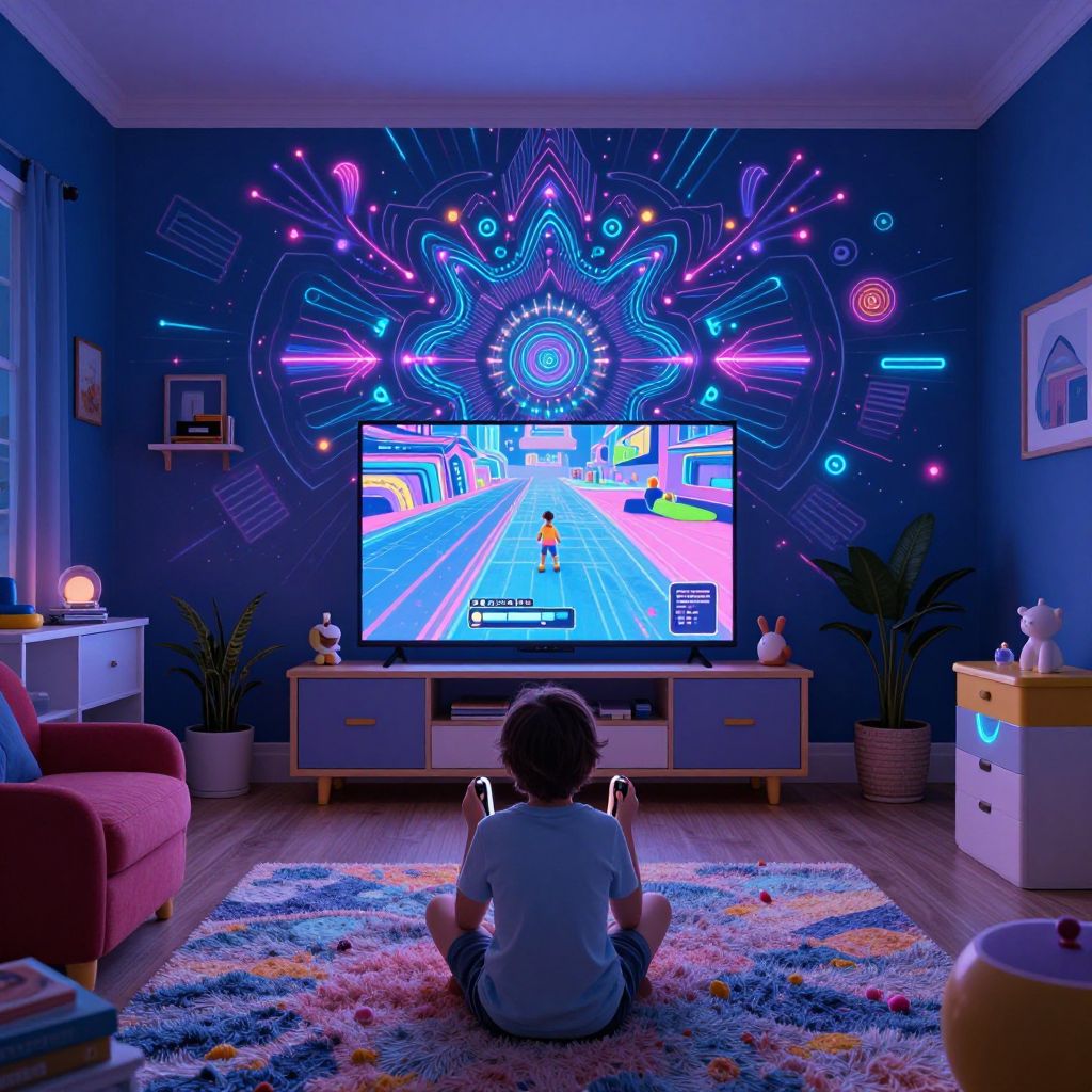 Photograph of a child sitting cross-legged on a colorful, patterned rug, facing a large TV screen displaying a racing game. The child, with short dark hair, wears a light blue shirt and sits in a room with dark blue walls adorned with a vibrant, neon-style mandala mural. A pink couch is on the left, and a wooden dresser with a small plant is on the right. The TV is centered on a white console, with a potted plant on each side. The room is lit by soft, ambient lighting, creating a cozy, futuristic atmosphere.