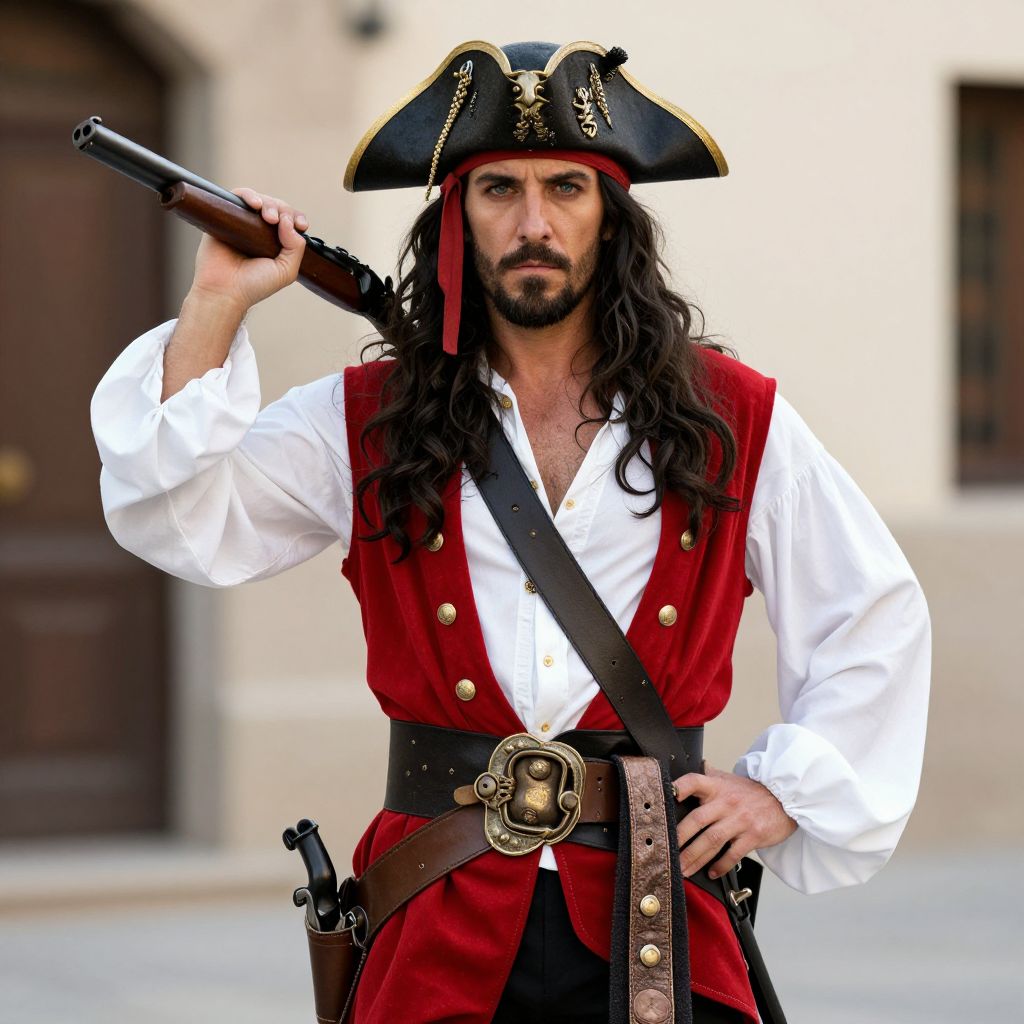 Photograph of a rugged, bearded man with long black hair, wearing a pirate hat, red vest, white shirt, and brown belt, holding