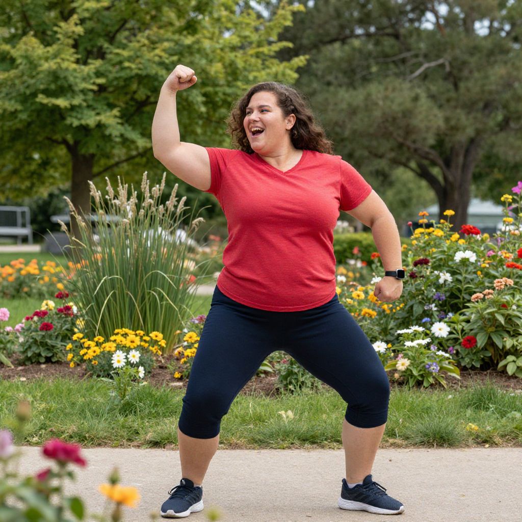 Photograph of a plus-sized woman with curly brown hair, wearing a red t-shirt and black capri leggings, flexing her right arm in a triumphant pose. She has a joyful expression with her mouth open. She wears black sneakers and a black wristwatch. The background features a vibrant garden with colorful flowers, green grass, and tall trees. The scene is outdoors on a sunny day, with a blurred path in the foreground and a white fence partially visible in the distance.