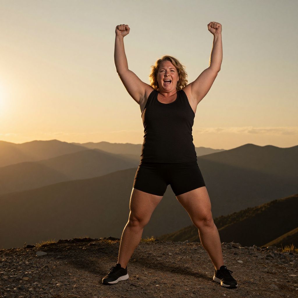 Photograph of a plus-sized woman with curly brown hair, wearing a red shirt and black capri pants, flexing her right arm and smiling outdoors