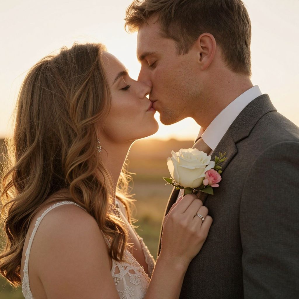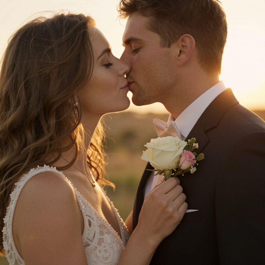 Romantic couple sharing a tender kiss at sunset, with the woman's hand gently adjusting her partner's boutonnière featuring a white rose and pink accents, set against a warm, golden backdrop.