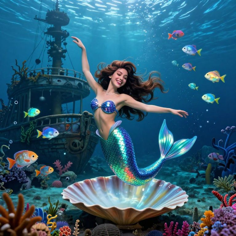 An enchanting underwater scene showcases a mesmerizing dance between a captivating mermaid with shimmering scales and a school of glowing fish in a style reminiscent of Lisa Frank's whimsical artistry. The mermaid's alluring gaze contrasts with her joyful smile as she gracefully balances on an enormous seashell, surrounded by a kaleidoscope of vibrant colors and textures. An air of intrigue and mystery envelops the scene as an ancient sunken vessel rises from the depths, its weathered skeleton adorned with thriving seaweed, blending history and fantasy in a captivating tableau.