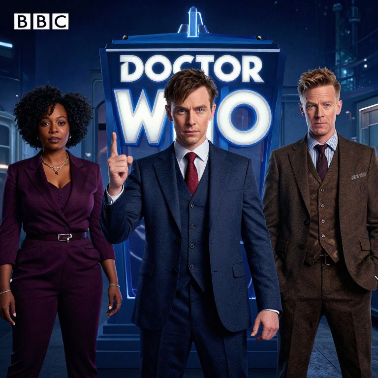 Photograph of three characters standing in front of a neon "DOCTOR WHO" sign. The central figure, a white man with short brown hair, wears a dark blue three-piece suit, white shirt, and red tie, raising his index finger. To his left, a black woman with curly hair in a dark purple suit and white blouse stands confidently. On his right, a white man with blond hair in a brown three-piece suit and blue shirt looks serious. The background is a dimly lit urban night scene with blue lighting. "BBC" logo is in the top left corner.