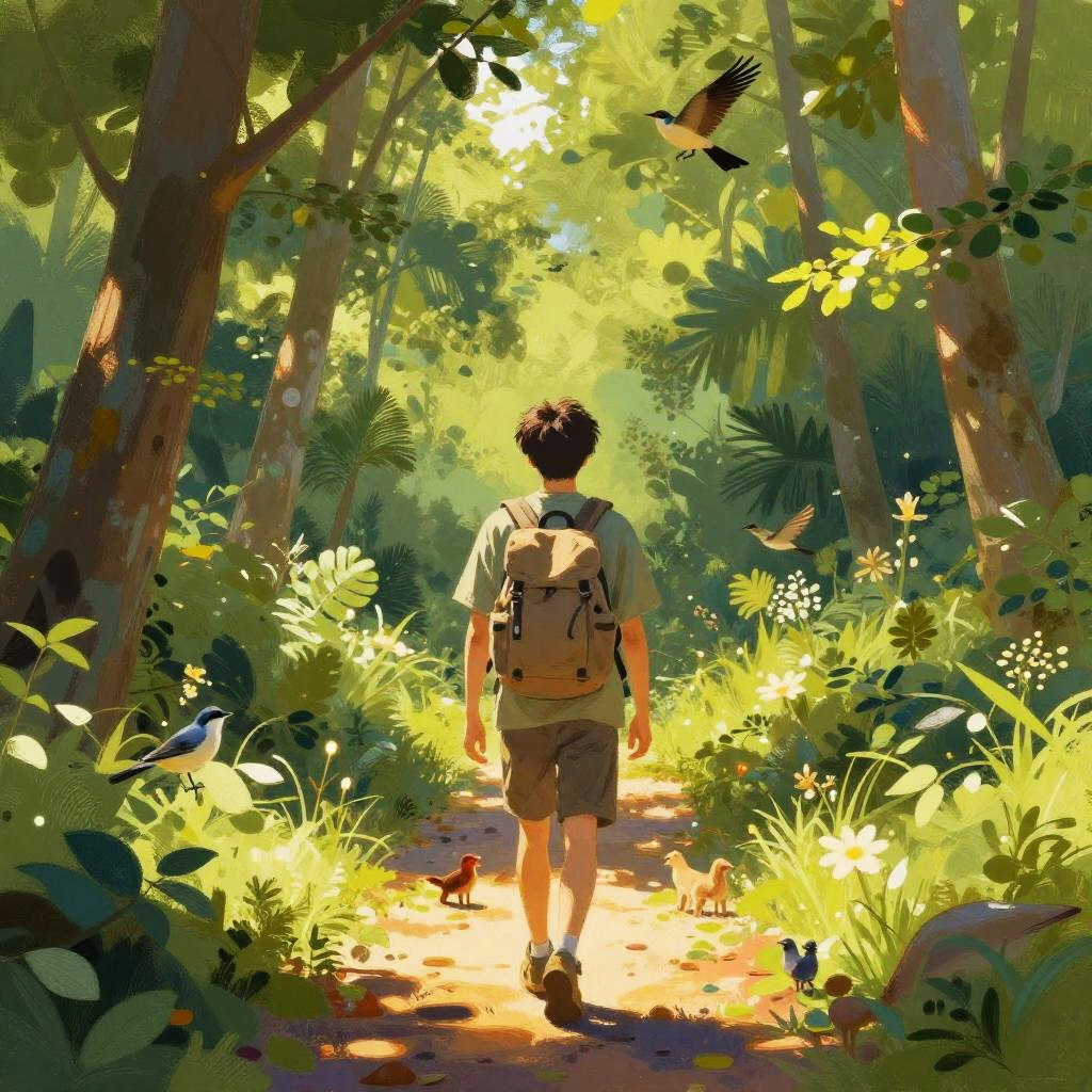 Unemployed young adult exploring nature trail with a backpack, symbolizing self-discovery and new beginnings, early morning light, lush green forest with birds and small animals around, impressionistic style, vibrant and uplifting.