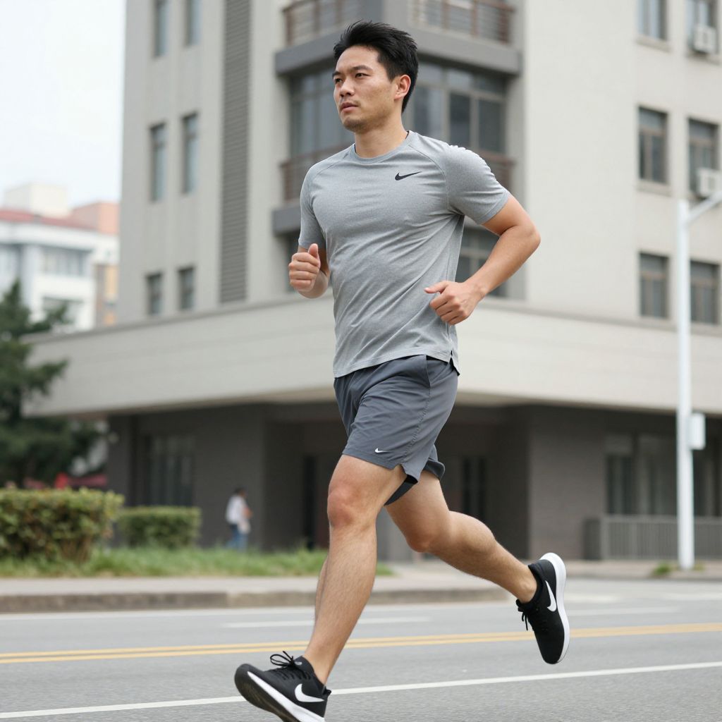 Photograph of an Asian man in a gray Nike shirt and gray shorts jogging on a city street, buildings in the background.