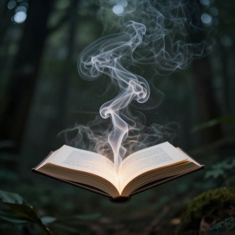 Photograph of an open book in a forest, with ethereal blue-white smoke rising from its pages, set against a dark, blurred background of trees