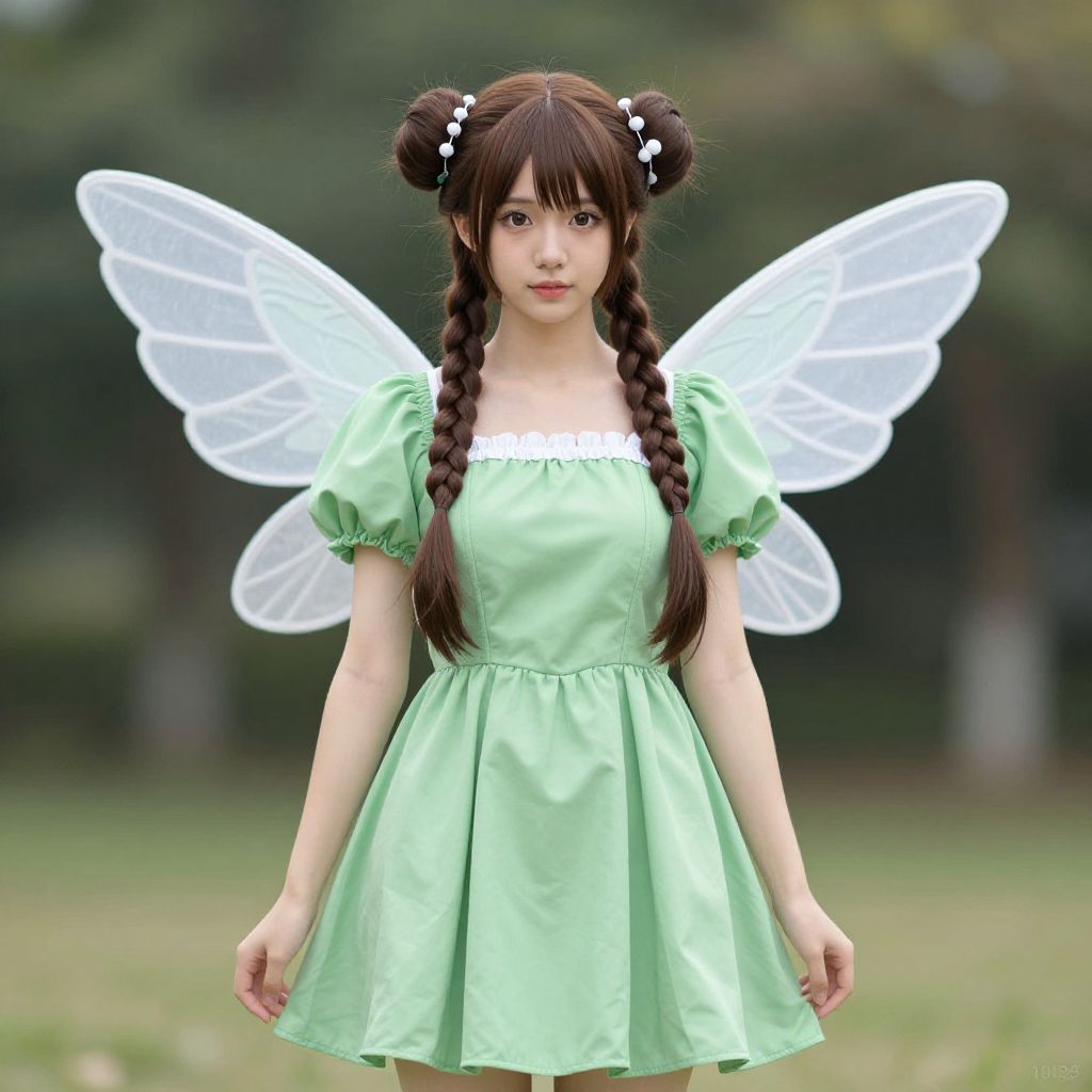 Fairy tail costume adult, 1girl, solo, wings, braid, dress, long hair, brown hair, hair ornament, blurry background, looking at viewer, blurry, fairy wings, fairy, double bun, puffy sleeves, watermark, green dress