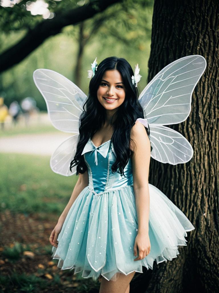 Light fairy costume, 1girl, solo, wings, long hair, fairy wings, blurry background, blurry, looking at viewer, dress, fairy, black hair, realistic, outdoors, tree, smile