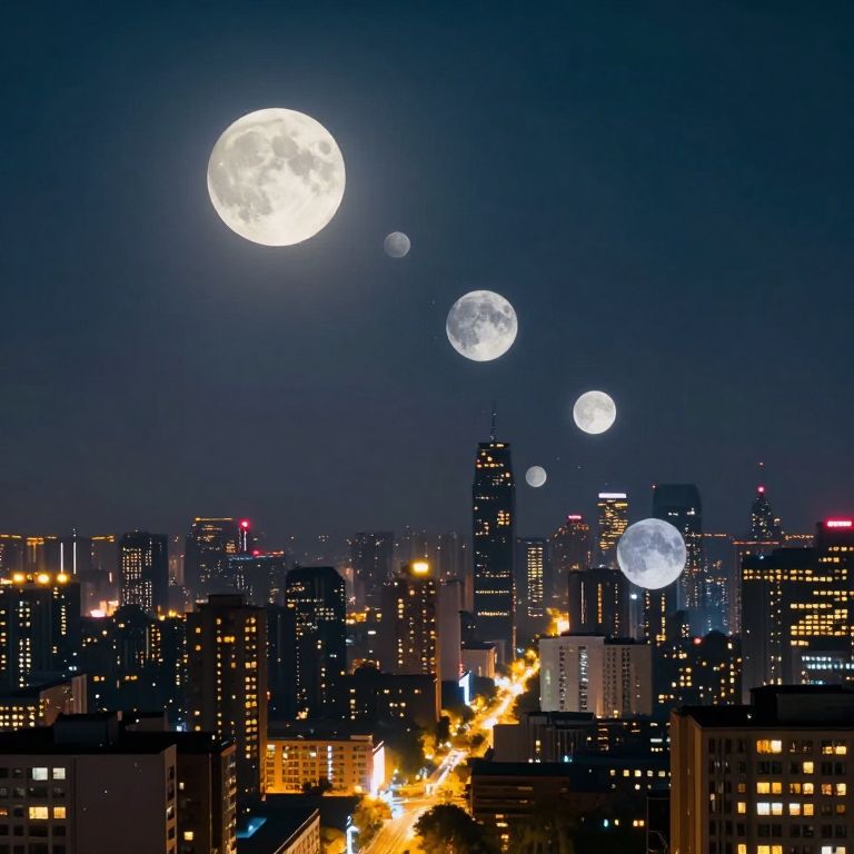 Photograph of a cityscape at night with a surreal, celestial effect. A large, bright full moon dominates the dark blue sky, accompanied by three smaller, white lunar phases trailing downward in a diagonal line. The city below features numerous illuminated skyscrapers with yellow and white lights, and neon signs in pink and blue. The sky transitions from deep blue at the top to a lighter shade near the horizon. The moonlight casts a soft glow on the city buildings, highlighting their silhouettes and creating a contrast with the dark night.