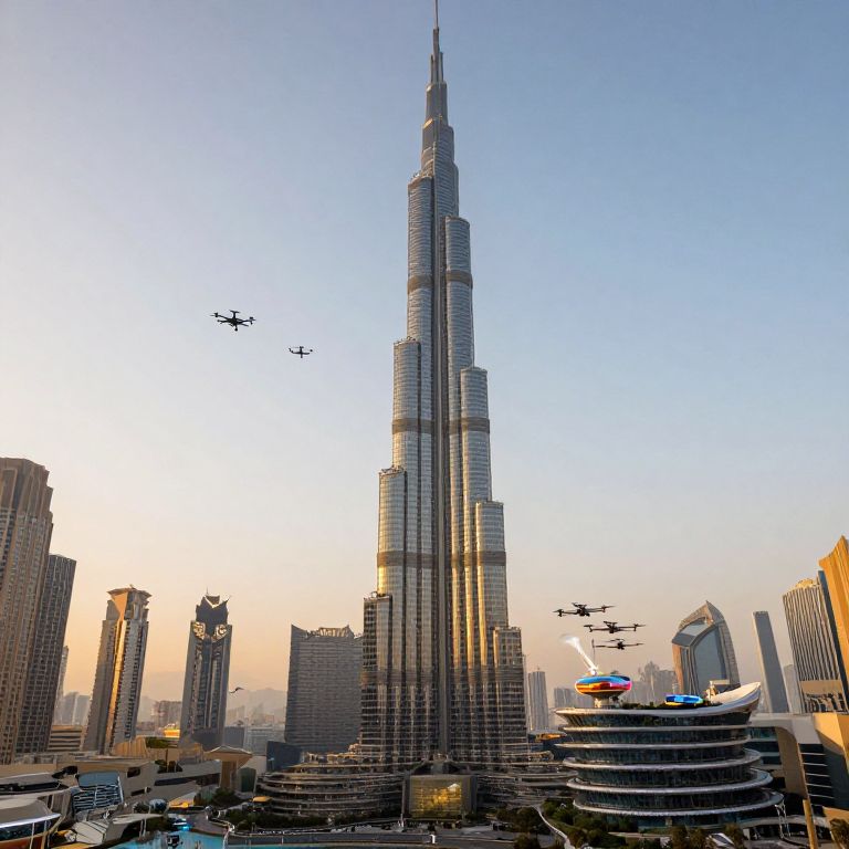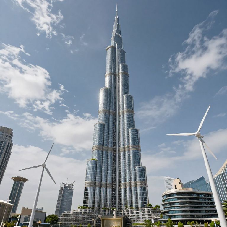 Burj Khalifa AI prompt: An immersive AI artwork showing the Burj Khalifa with integrated AI climate control systems, green vertical gardens, and AI-guided wind turbines, set against a cloud-filled sky with dynamic weather simulation in a realistic and modern urban landscape.