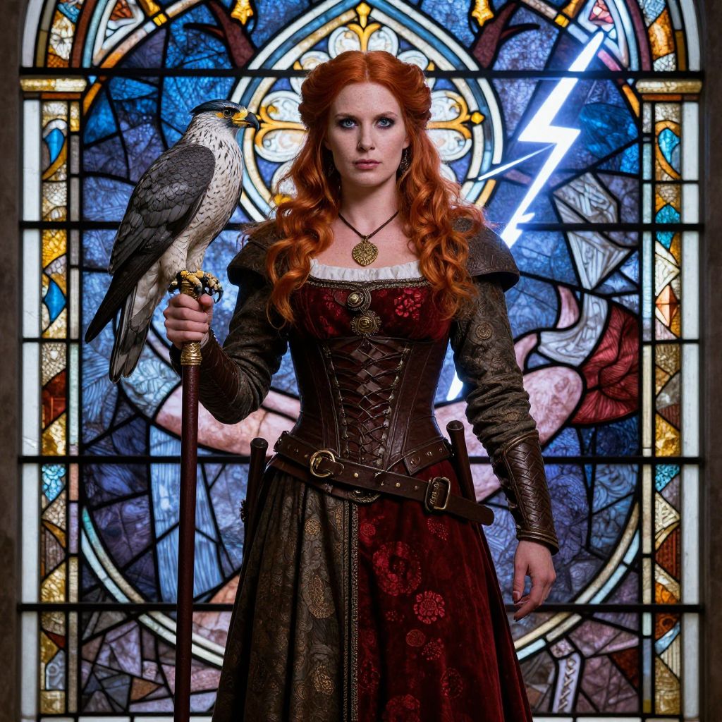 A red-haired woman-warrior in a 13th-century dress stands with a falcon, set against a stained glass background with intricate designs and a lightning bolt.