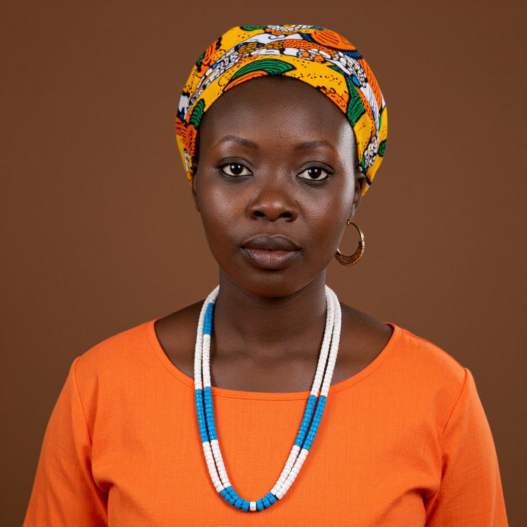 Portrait of a Ugandan woman wearing a vibrant orange top, a colorful yellow headscarf adorned with orange and green patterns, and accessorized with a gold hoop earring and a beaded necklace featuring alternating white and blue beads.