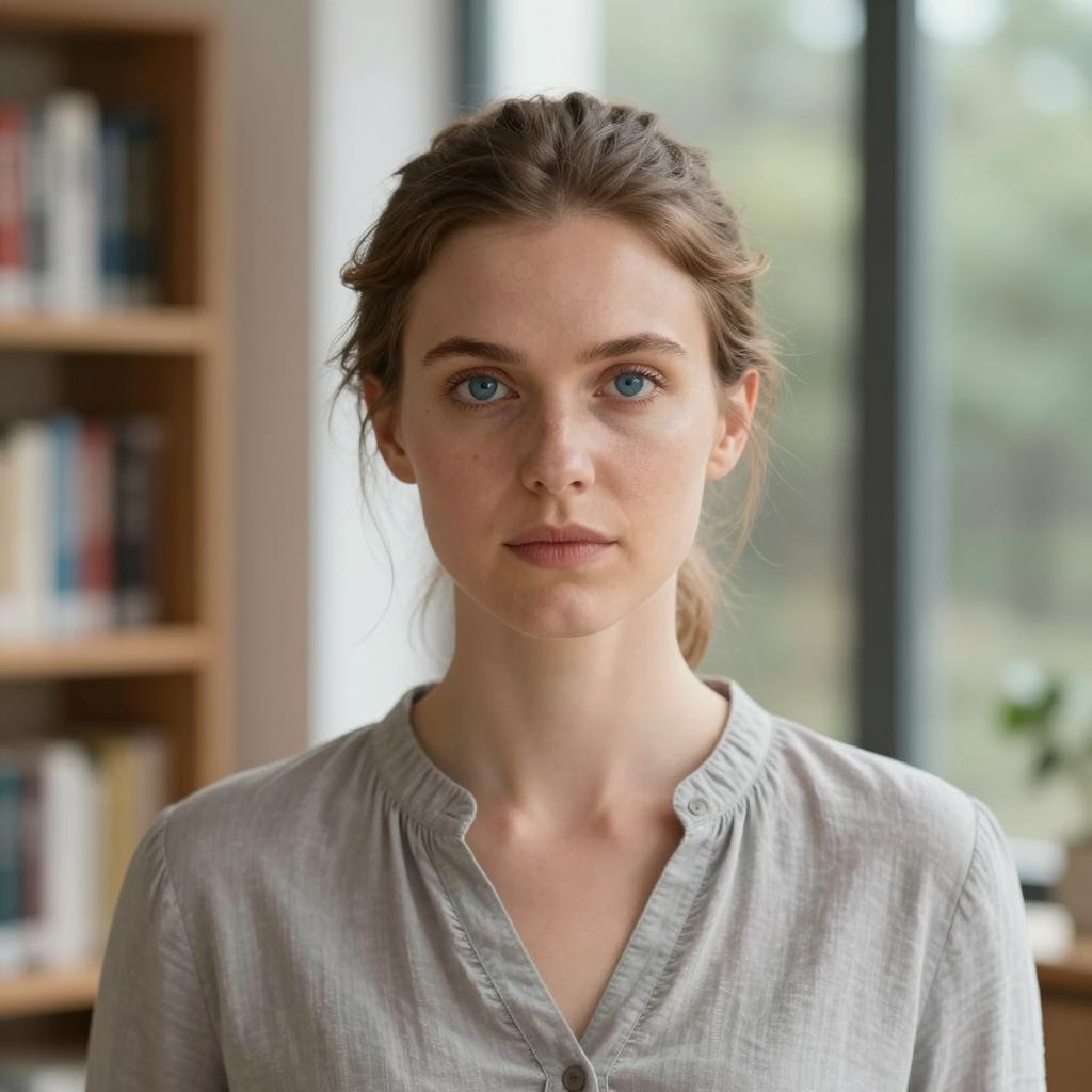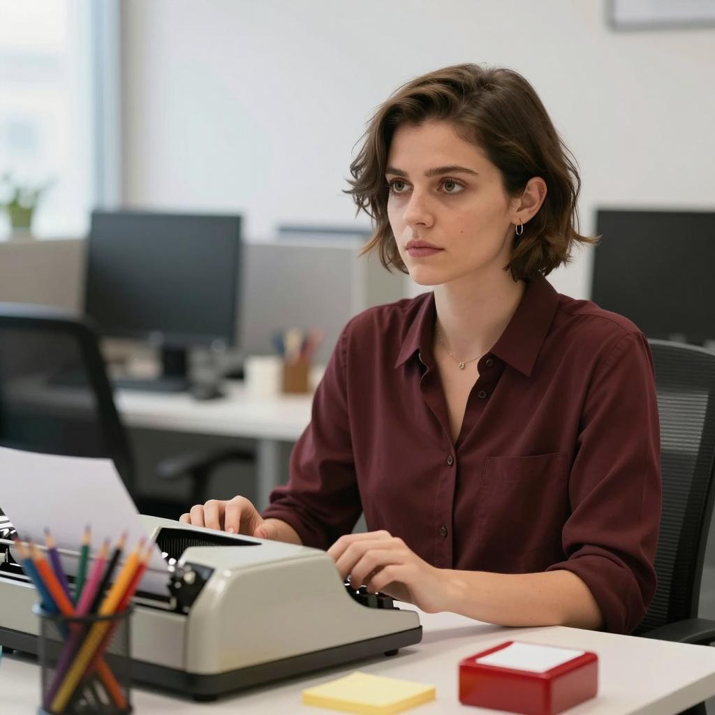 Woman with shoulder-length brown hair, wearing a white long-sleeve top and white skirt, sitting on the floor against a wall. Legs extended, hands clasped. Desk with stacked papers and a teal folder on the left. Black office chair on the right. Open binder with papers and a pen on the floor next to her. Dimly lit room with gray carpet.