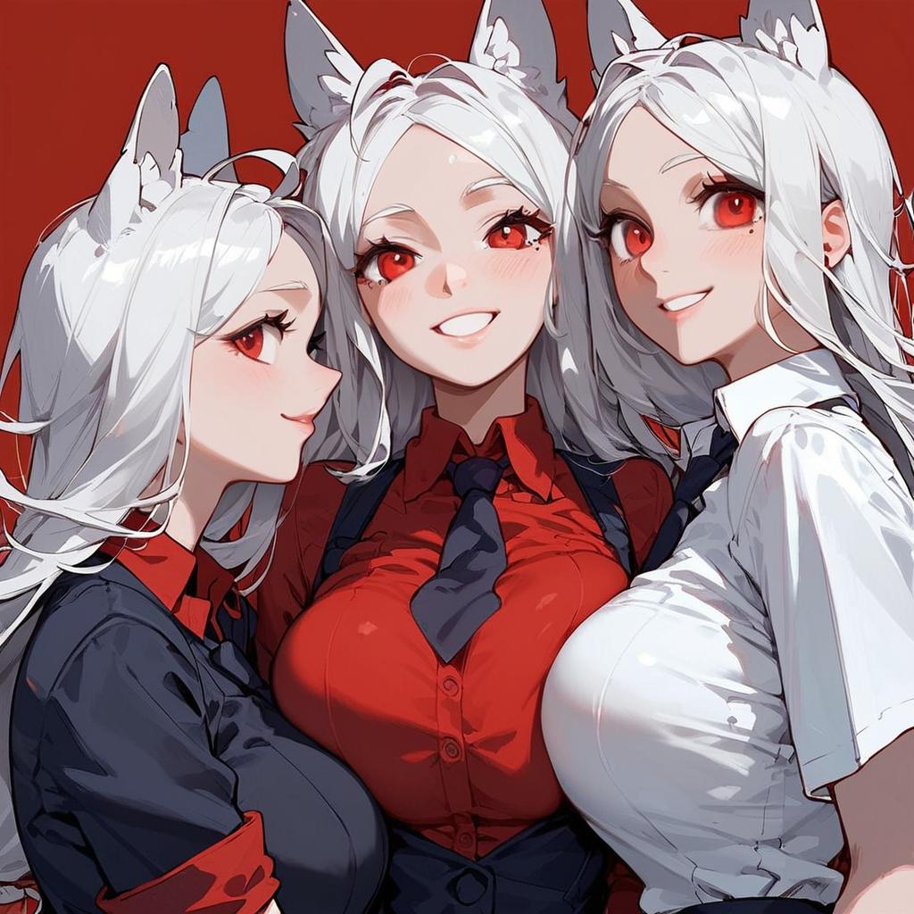 Score_9, score_8_up, score_7_up, score_6_up, score_5_up, score_4_up, , source_cartoon, source_anime, 3girls, cerberus \(helltaker\), white hair, long hair, red eyes, dog ears, red shirt, black necktie, black vest, sadistic smile, upper body, looking at viewer