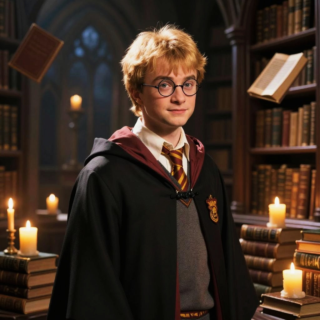 Harry Potter blonde wizard standing in a mystical library filled with floating books and glowing candles, wearing signature round glasses and a Hogwarts robe, magical golden light illuminating his hair, highly detailed fantasy scene, cinematic lighting