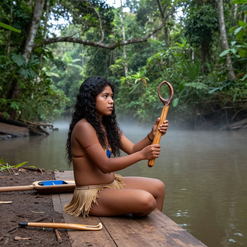A morning scene in the Amazon rainforest showing a young indigenous woman with dark, curly hair and sharp, defined facial features sitting on a wooden platform near a river, her hands holding a carved wooden fishhook, with the lush green canopy above and mist rising from the water, the environment rich with biodiversity and traditional tools on the ground.