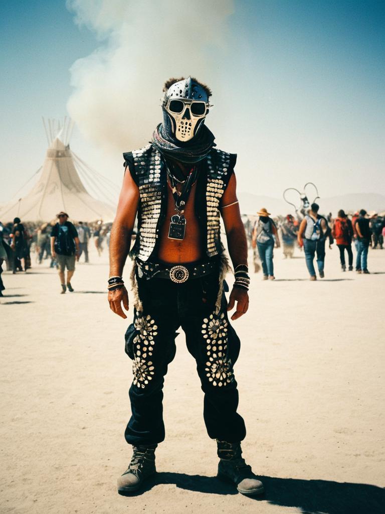 Man in Burning Man outfit, candid festival photo, realistic tones