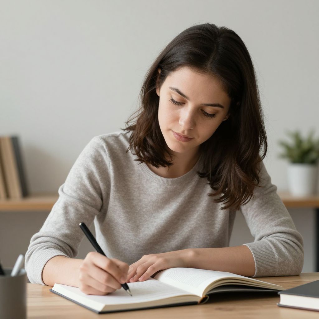 Photograph of a young woman with shoulder-length dark brown hair, wearing a light gray, long-sleeved sweater, sitting at a wooden table. She is focused on writing in an open book with a black pen in her right hand. The background is slightly blurred, showing a white wall and a shelf with a few books and a green potted plant. The image has a soft, natural light, creating a calm, studious atmosphere. Her expression is concentrated, and her eyes are directed downward at the book.