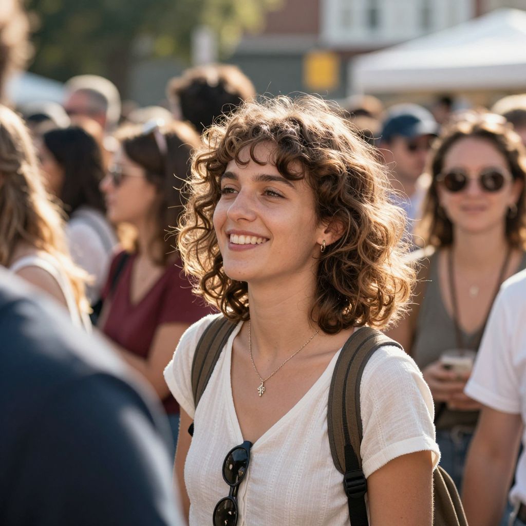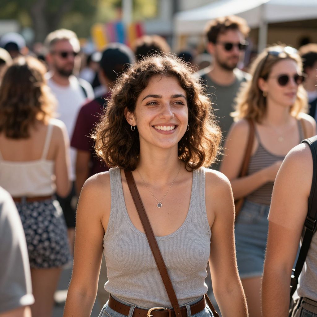 Amidst the vibrant energy of a bustling crowd, a woman in a sunlit scene exudes a radiant sense of freedom and nostalgia, her smile a beacon of joy as she prepares to embark on a journey of shared passion and community.