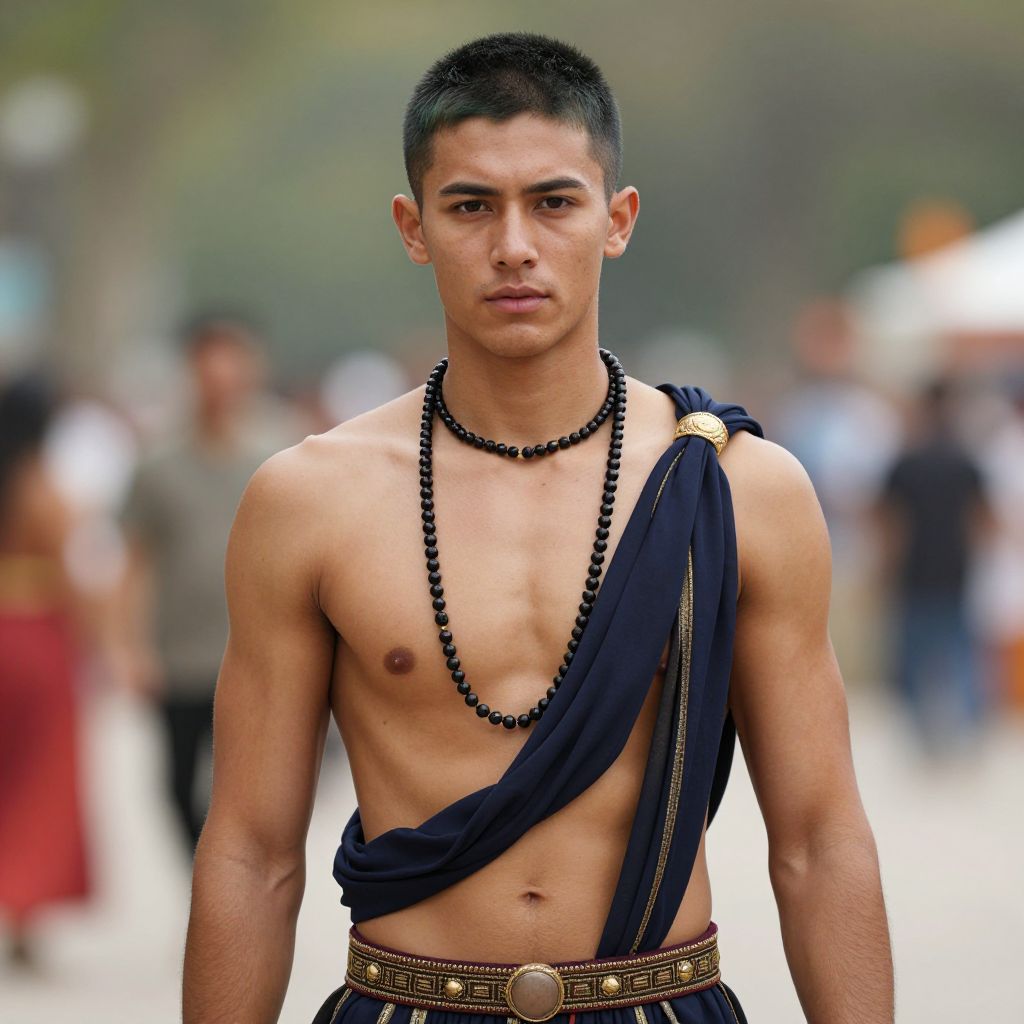 Male toga costume, 1boy, male focus, necklace, jewelry, solo, blurry, blurry background, looking at viewer, abs, beads, navel, muscular, green hair, outdoors