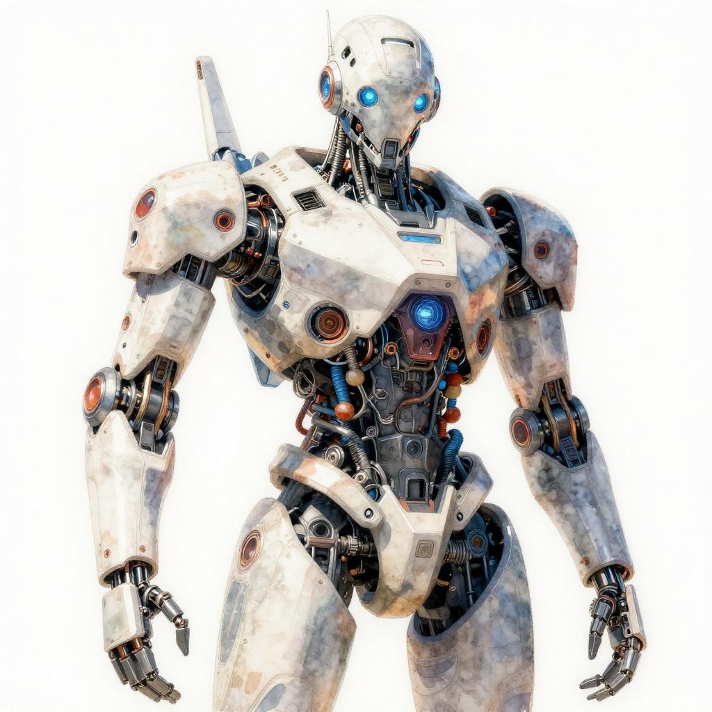 Futuristic cyberpunk robot rendered as detailed watercolor painting with dramatic chiaroscuro lighting, transparent background, ultra HD, vivid colors, highly detailed, perfect composition, photorealistic concept art, trending on ArtStation, 8K resolution