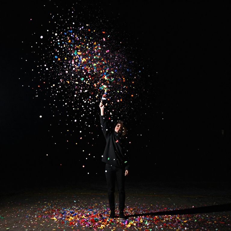 Photograph of a man in a black suit standing against a black background, throwing colorful confetti that streams upwards and scatters on the ground.