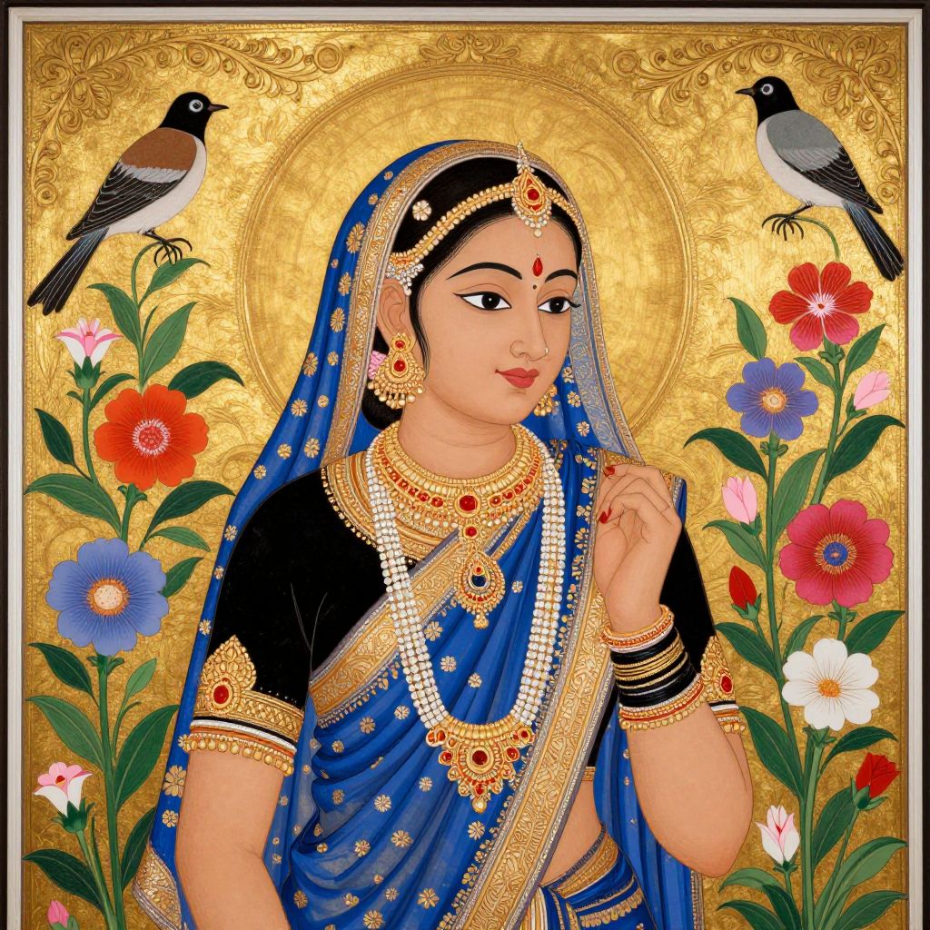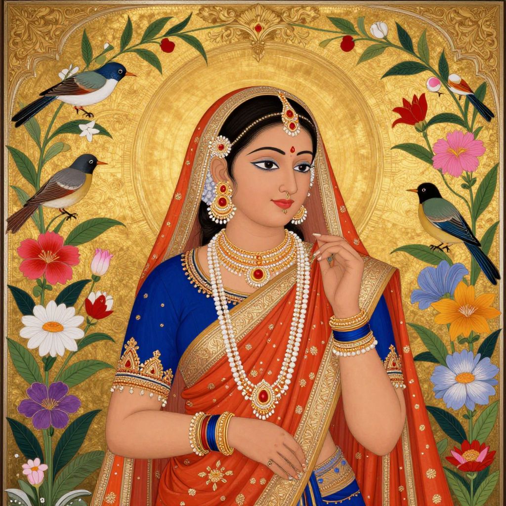 A vibrant digital illustration inspired by Indian miniature paintings, featuring a woman adorned in traditional attire and jewelry, surrounded by colorful flowers and birds against a radiant golden backdrop, showcasing intricate details and a harmonious blend of cultural and natural elements.
