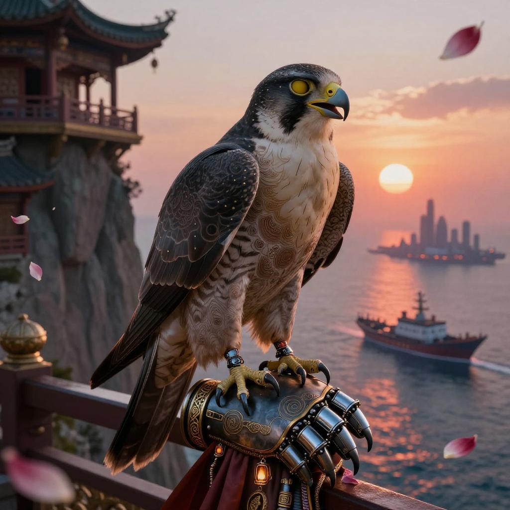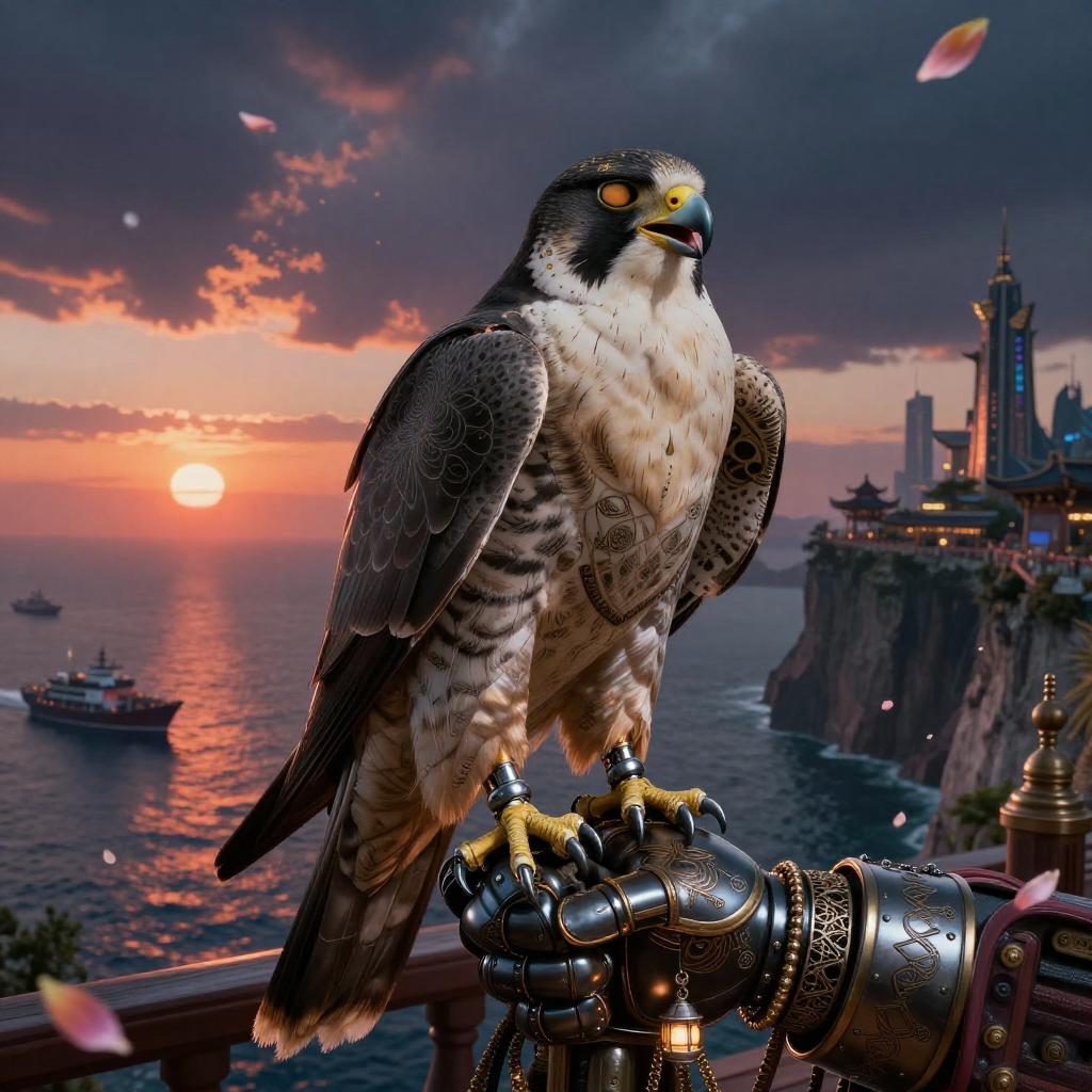 Best quality, masterpiece, ultra high res, raw photo, beautiful and aesthetic, deep shadow, dark theme, (photorealistic:1.4), masked peregrine falcon perched on a lacquered cybernetic gauntlet, razor gaze and subtle brass facial sigils, wearing lacquered falconry gauntlet with layered silk tabard, alloy talon fittings, filigree straps and tiny lantern charms, soft smile, open mouth, closed eyes, ((chiaroscuro, backlight, sunset, petals floating)), graceful poise, evocative atmosphere, magnetic presence, captivating mystique, intricate zentangle patterns, astonishing level of detail, striking perspective, a chaotic masterpiece balanced by harmony, vibrant color palette, ((outdoors)), cliffside monastery balcony overlooking a neon ocean of floating ships and a distant futurist skyline beneath aurora-lit dusk, windblown petals and salt mist, inspired by futurist architecture