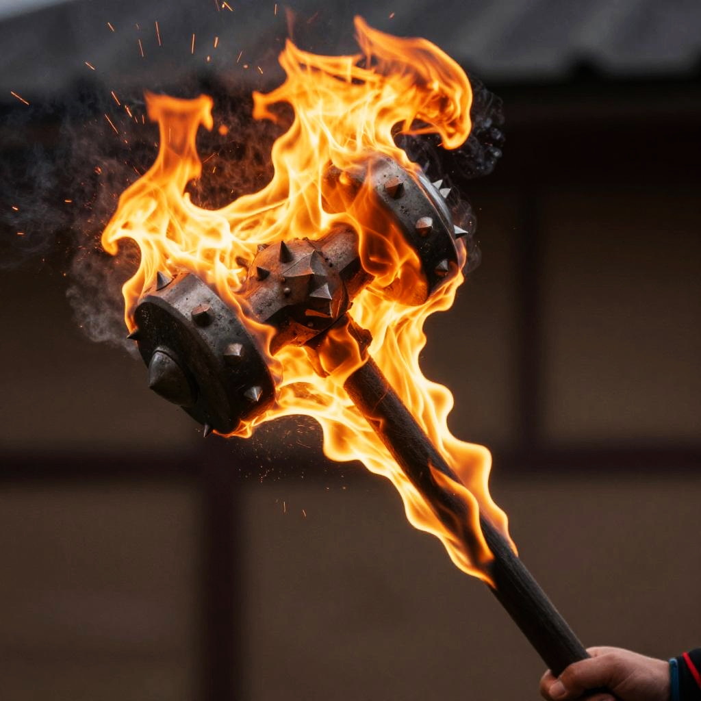 Close-up of a flaming mace in mid-swing, fire swirling around the heavy spiked head, sparks bursting, background blurred to emphasize motion and heat, dynamic composition
