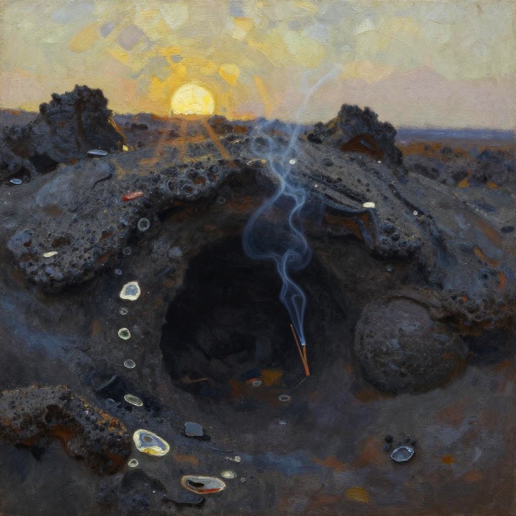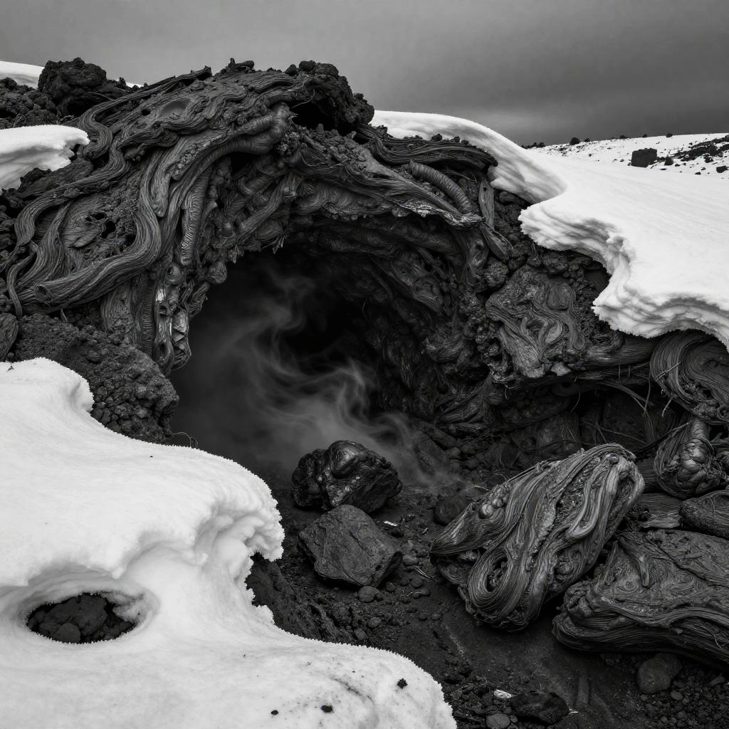 Lava Tube Passage, ashy volcanic ash fields, slow drifting snow, late night with muted light, monochrome sketch, high detail