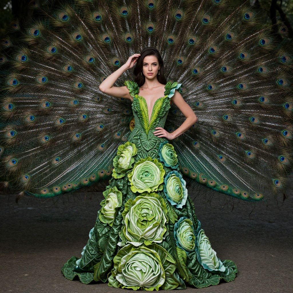 Ultra realistic, very detail photoshoot, 20 yo pretty woman, ((wear a long dress inspired by the iconic cabbage dress, blending fashion and nature. Describe its mesmerizing details in 3 sentences)), envision the wearer striking a pose reminiscent of a peacock