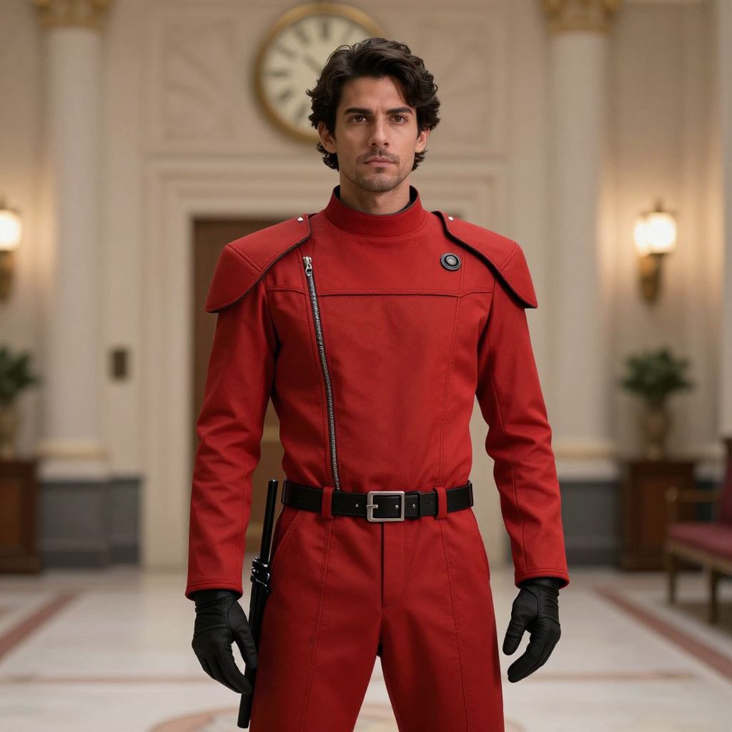 Photograph of a medium-build man with dark curly hair and a serious expression, standing in an elegant, well-lit room. He wears a bright red, form-fitting military-style uniform with black shoulder pads, black belt, and black gloves. The uniform has a zipper running diagonally across the chest. The background features cream-colored walls, two wall-mounted sconces with lit bulbs, and a large circular clock above a wooden door. The room has a polished marble floor with red and white patterns, and there are potted plants on either side. The overall style is formal and sophisticated.