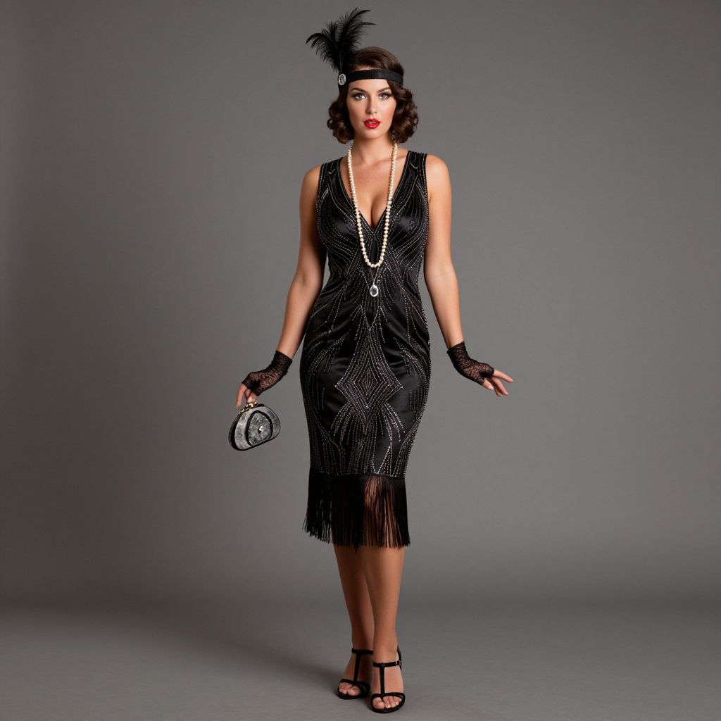Full body shot, busty woman, vintage flapper dress, knee-length, black silk fabric, intricate beadwork, art deco patterns, fringed hemline, sleeveless design, deep V-neckline, matching feathered headband, long pearl necklace, fingerless lace gloves, classic T-strap heels, retro clutch purse, glamorous makeup, bold red lips, wavy bob hairstyle, 1920s elegance, jazz age flair Sexy. Pretty face and beаutiful eyes. Big breasts