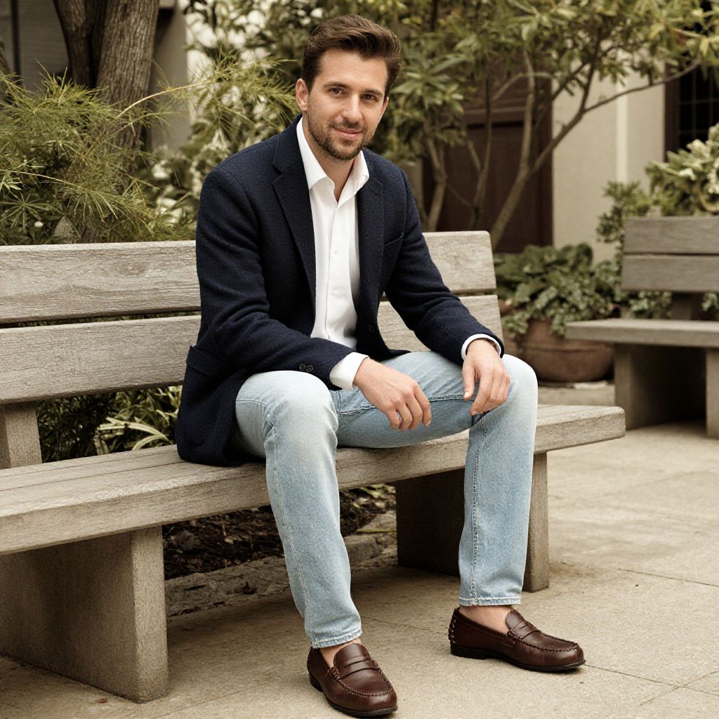 A man, navy wool blazer, white cotton shirt, light blue slim-fit jeans, brown leather loafers, open-air courtyard, wooden benches, lush greenery, sepia effect, relaxed smile. Man has masculine face and piercing eyes