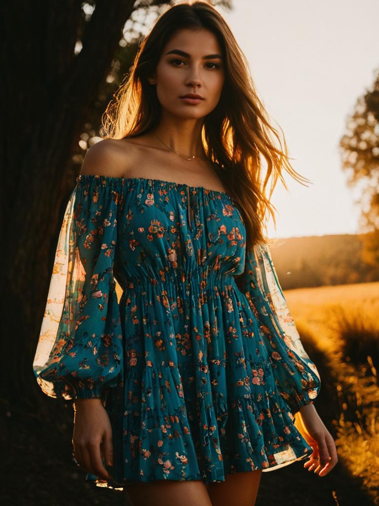 Woman, boho chic, off-the-shoulder mini dress with a floral pattern in vibrant pink, green, and blue, sheer billowy sleeves, elasticated smock neckline, tiered skirt, white background --sref 1393