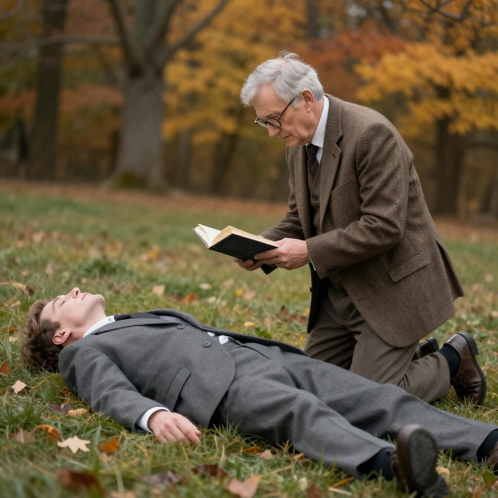 Old man with gray hair and glasses, brown tweed suit, kneels beside dead man in gray suit, lying on grassy hill. Old man reads book, dead man face down. Autumn forest background, trees with yellow and orange leaves.