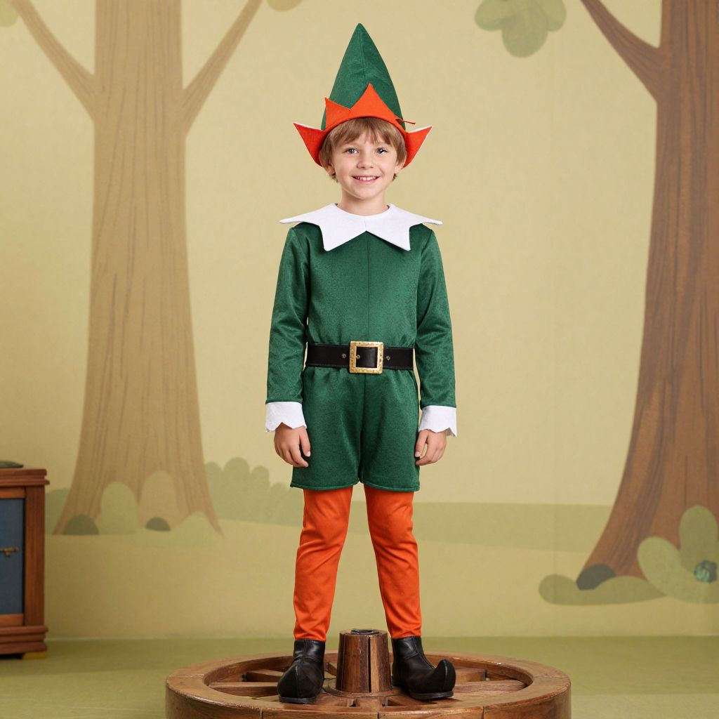 Photograph of a young boy standing on a wooden stump in a whimsical forest-themed setting. He wears a green elf costume with a pointed red and green hat, white collar, black belt with gold buckle, and bright orange pants. His black shoes are polished. The background features soft, pastel-colored trees and a wooden cabinet on the left. The boy has short brown hair, fair skin, and a cheerful smile. The image has a slight digital filter effect, enhancing the cartoonish, playful atmosphere.
