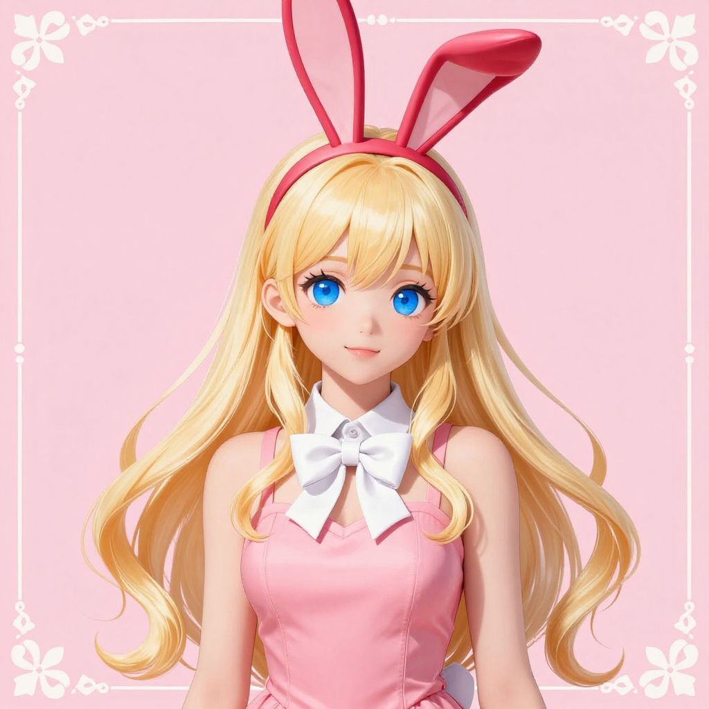 Digital illustration of a young anime girl with long blonde hair and striking blue eyes wearing a pink dress with a white bow. She has red rabbit ear-shaped hairband against a soft pink background with floral corners.