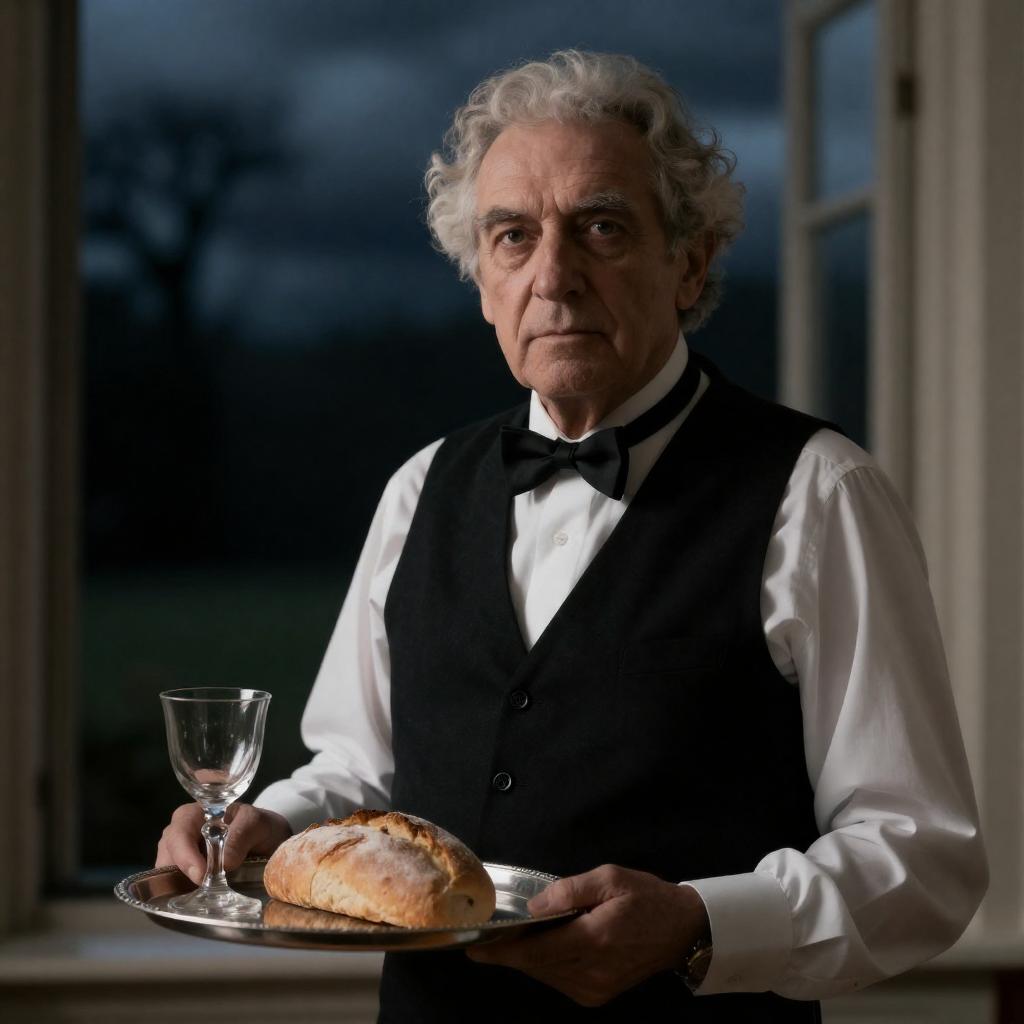 Old man with curly hair, black bow tie, white shirt, and black vest, holding a silver tray with a goblet and bread. Dark, stormy night background through a window. Silhouetted tree in the background. Serious expression.